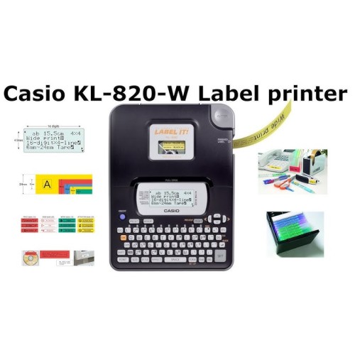 Casio’s KL-820 Label Printer makes it easy to print labels for home, school, and office use. Easy to use QWERTY keyboards makes creating labels simple and fast. Includes a 16-digit, 3 line, LCD display with 5 built-in fonts. With a resolution of 200 DPI, the KL-820 can print in five sizes (24mm, 18mm, 12mm, 9mm, 6mm).