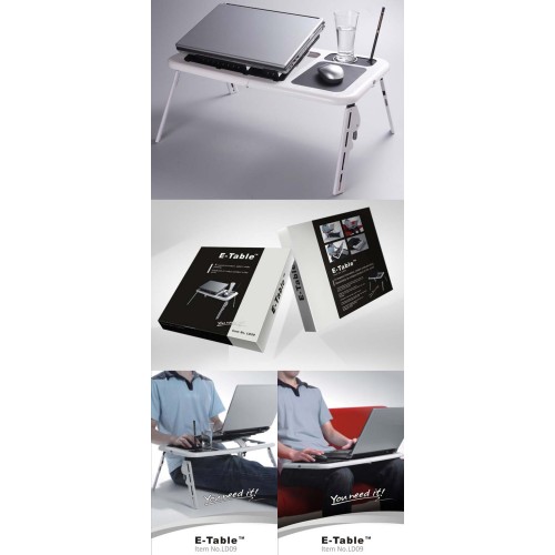 5. Description: Foldable laptop table with 2 USB fans, ABS plastic material with metal inside the legs.