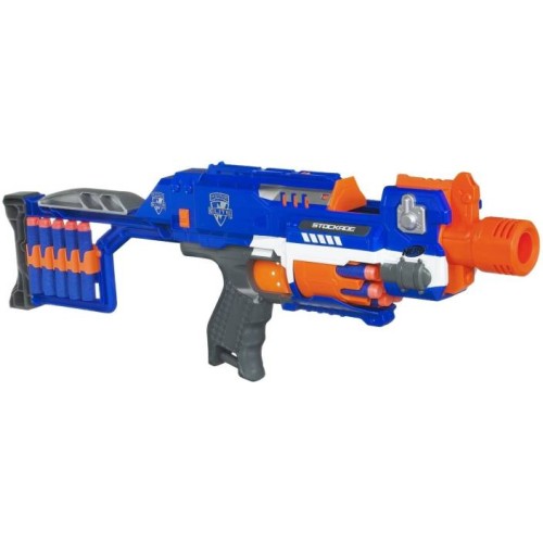 Join the N-Strike Elite and get the edge in battle with the Stockade blaster. There's no need for cocking, so just pull the trigger to unleash a semi-auto barrage of darts at targets up to 75 feet away. With a 10-dart revolving barrel, a Tactical Rail that's compatible with most N-Strike accessories and a removable stock, you can customise this powerful blaster for any battle. Store up to 10 darts in the removable stock so you won't run out of ammo, or attach the stock to other select N-Strike Elite blasters. You'll be the one to beat with the Stockade blaster in your hand.